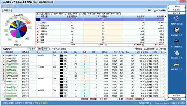 按類別,按顏色,按尺碼,按品牌統(tǒng)計庫存數據,并可 設置預警庫存,實時分析和庫存詳細情況顯示。在庫存統(tǒng)計界面中,可以方便的對 庫存信息進行實時調整。