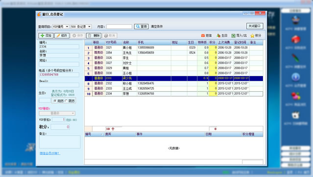 本系統(tǒng)支持會員與會員積分管理。 會員資料管理:登記會員的電話以及生日等基本信息。 積分管理 :可設置消費多少元積一分。積分還支持換購等功能。其他功能包括:生日提醒及祝福短信發(fā)送等。