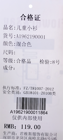 緞面材料,縫于衣服內(nèi)測(cè),防偽防竄貨效果好,不易丟失,初始化便捷。